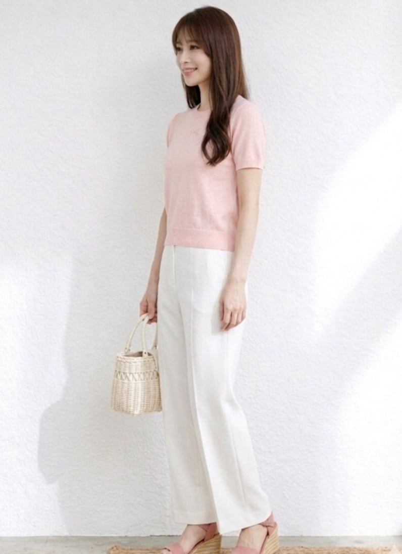 やさしいピンクカラーがふんわりと心をときめかせる、フェミニンな薄手ニット。