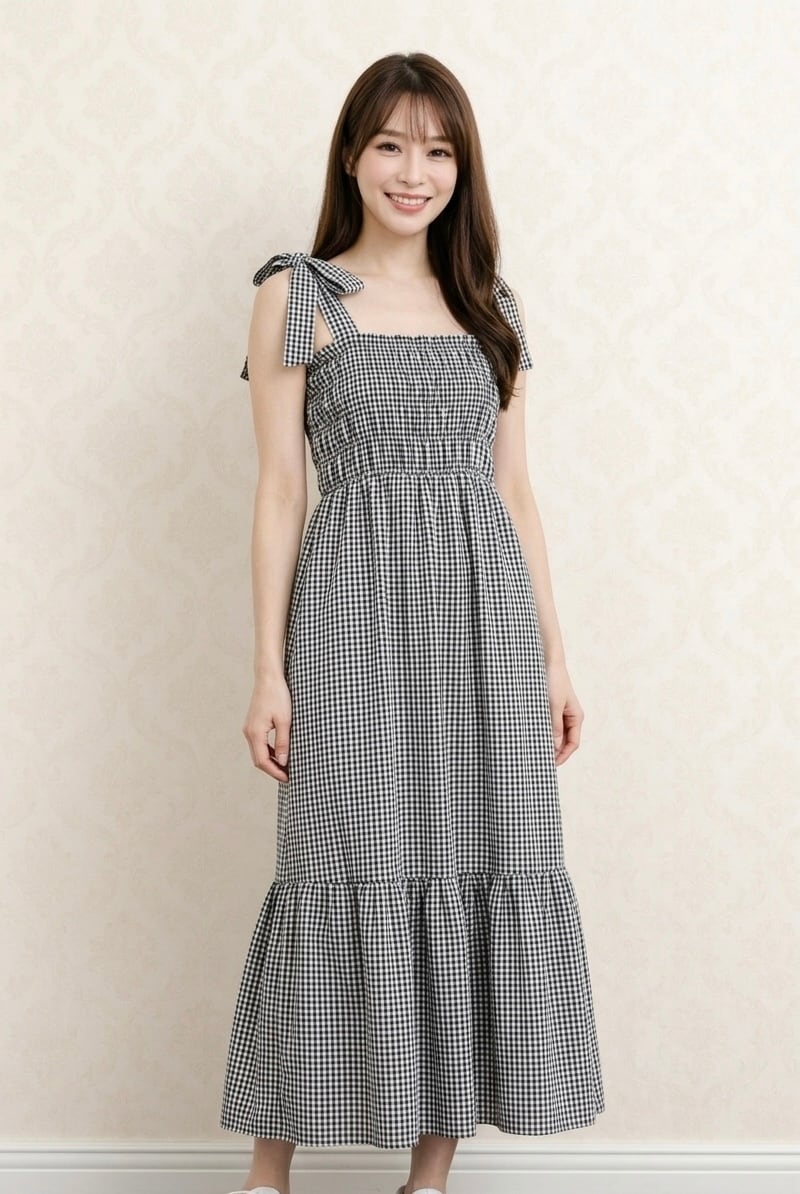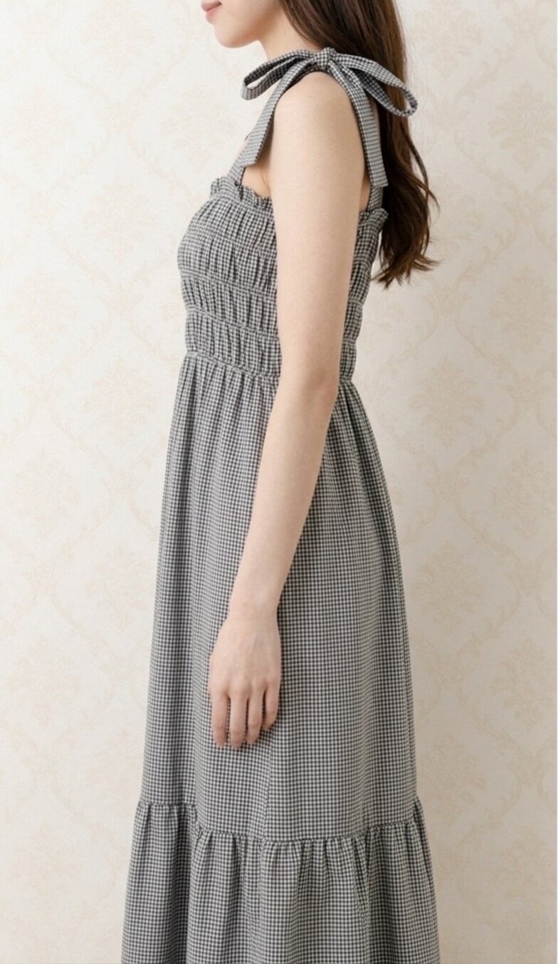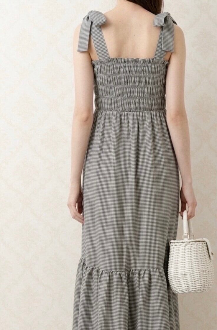 【予約販売】リボンショルダー ギンガムチェック ロングワンピース(Gray / Black)