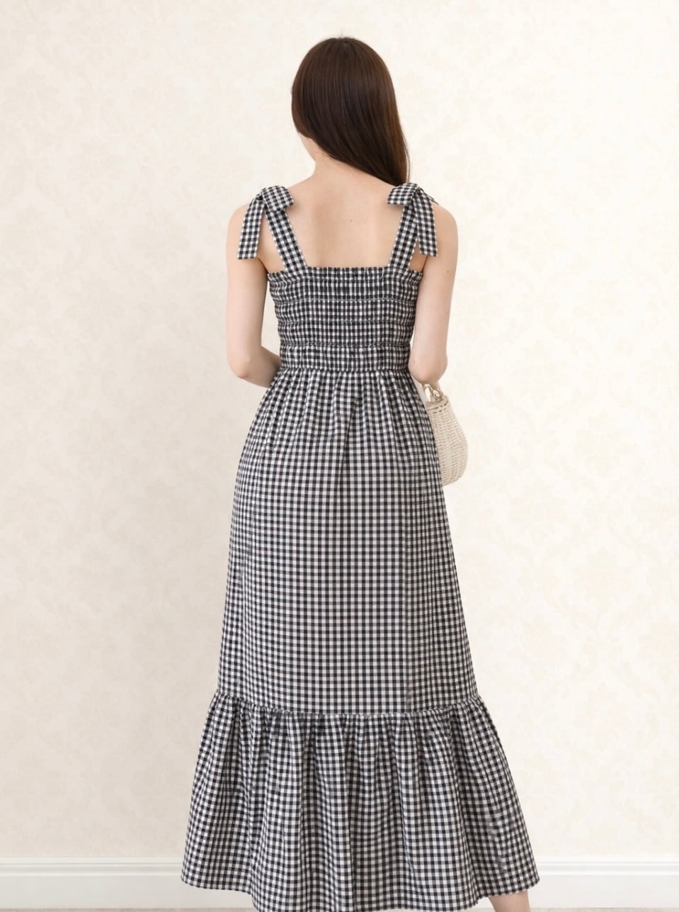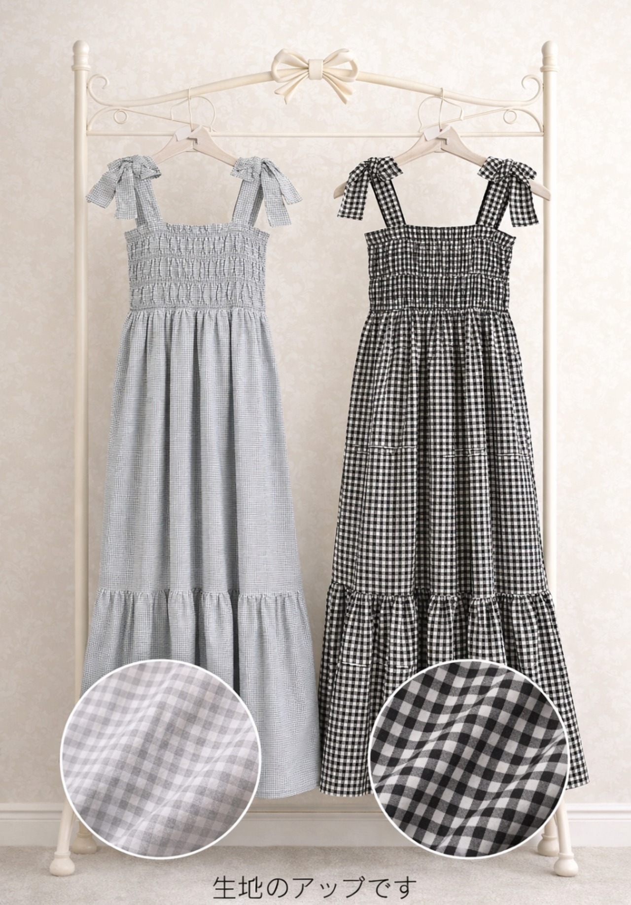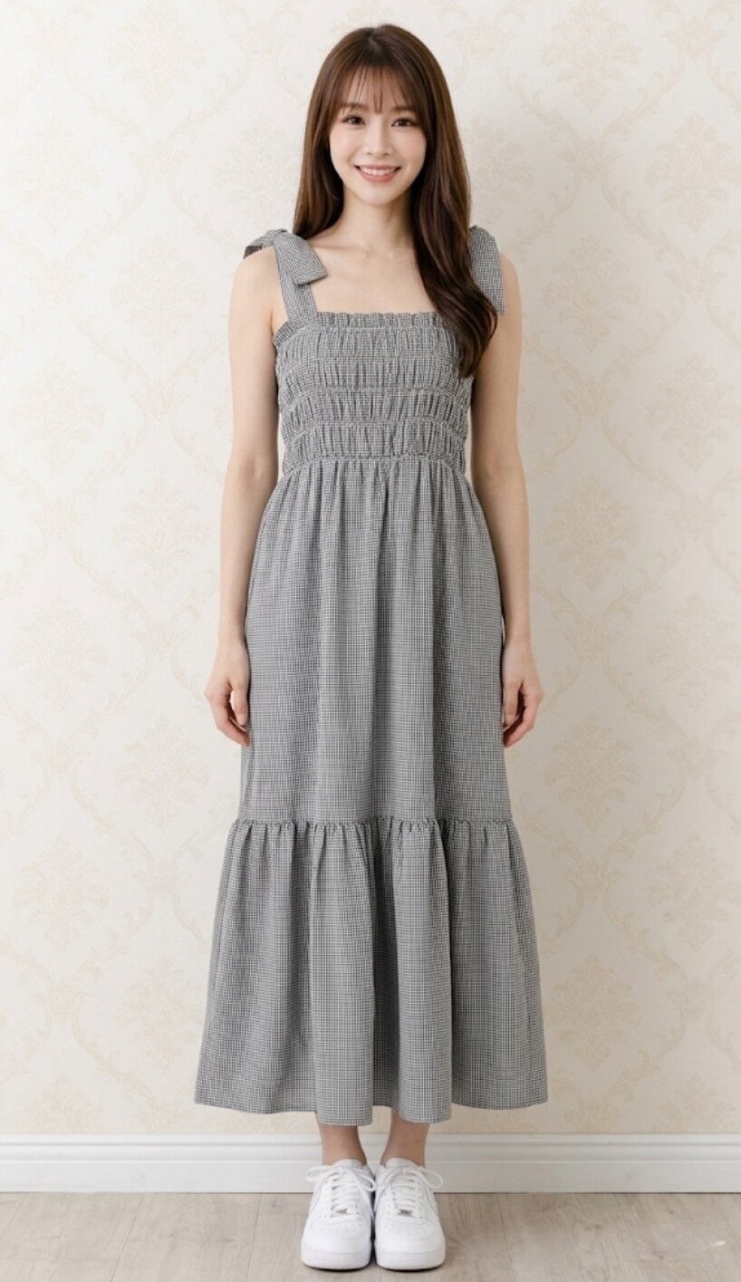 【予約販売】リボンショルダー ギンガムチェック ロングワンピース(Gray / Black)