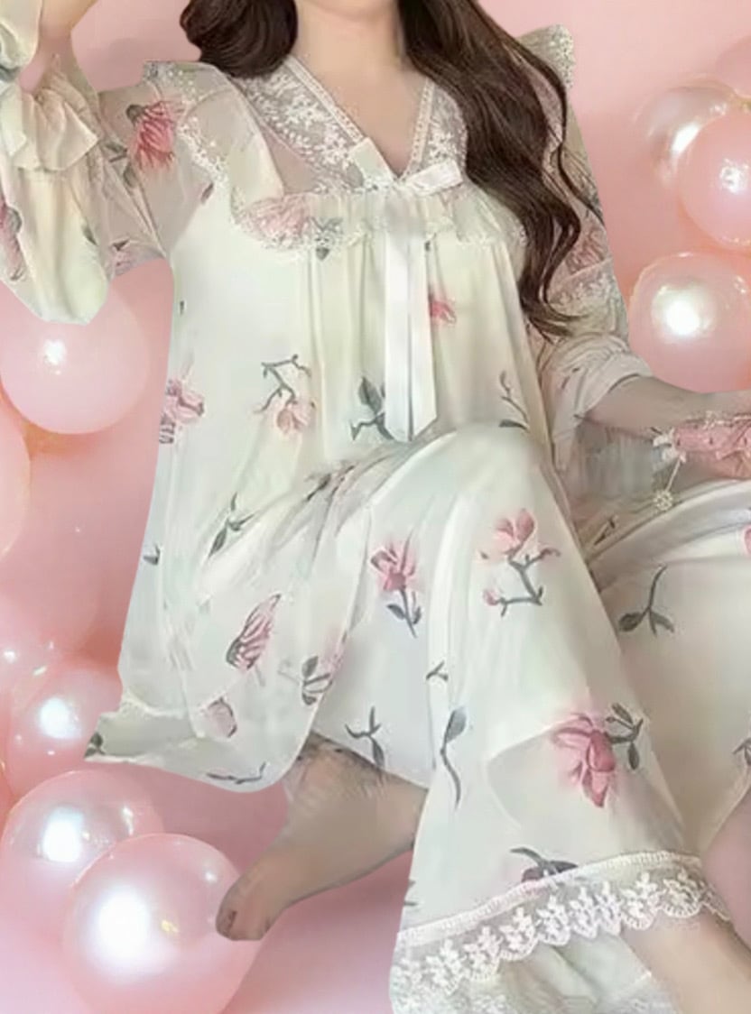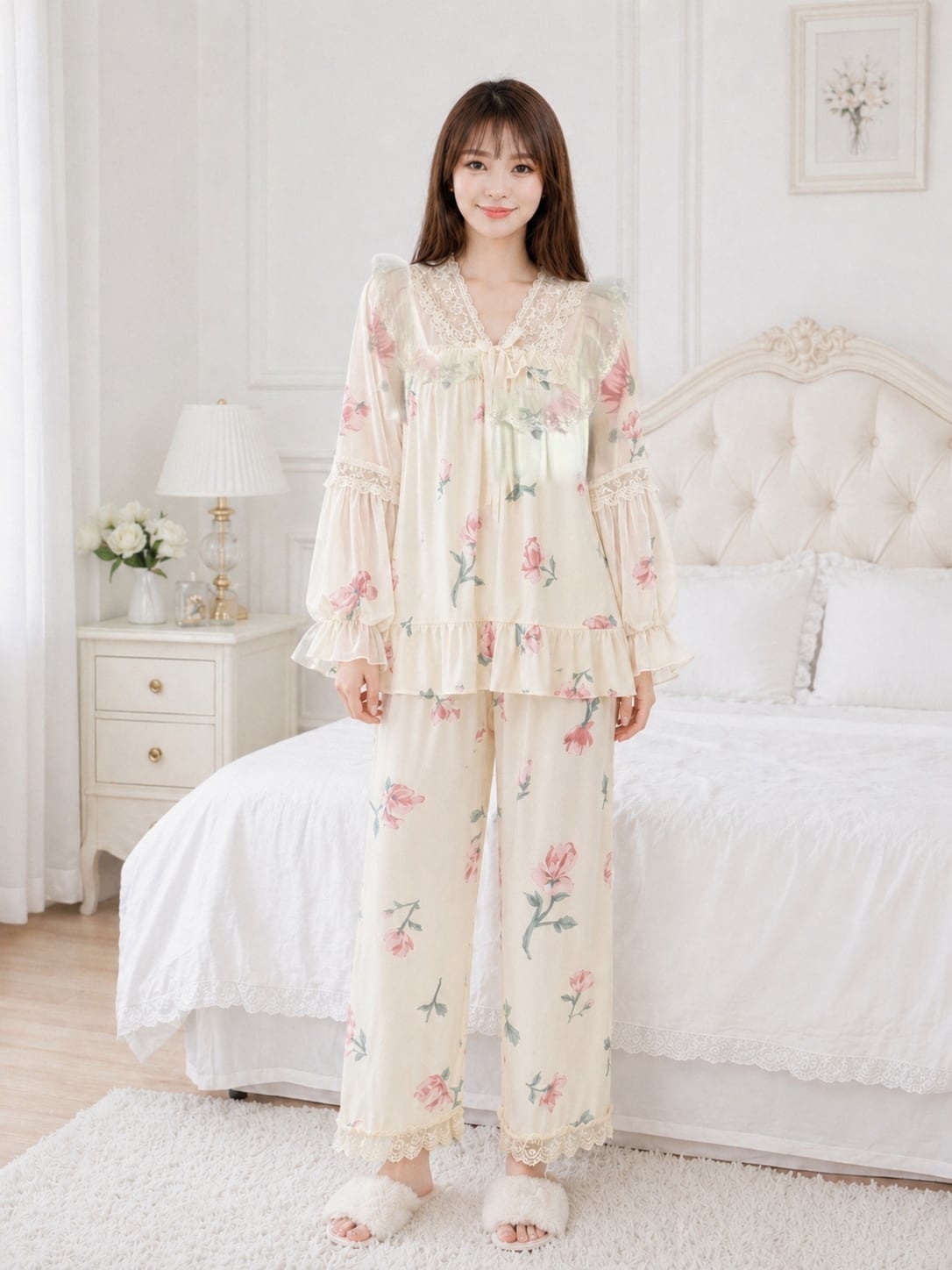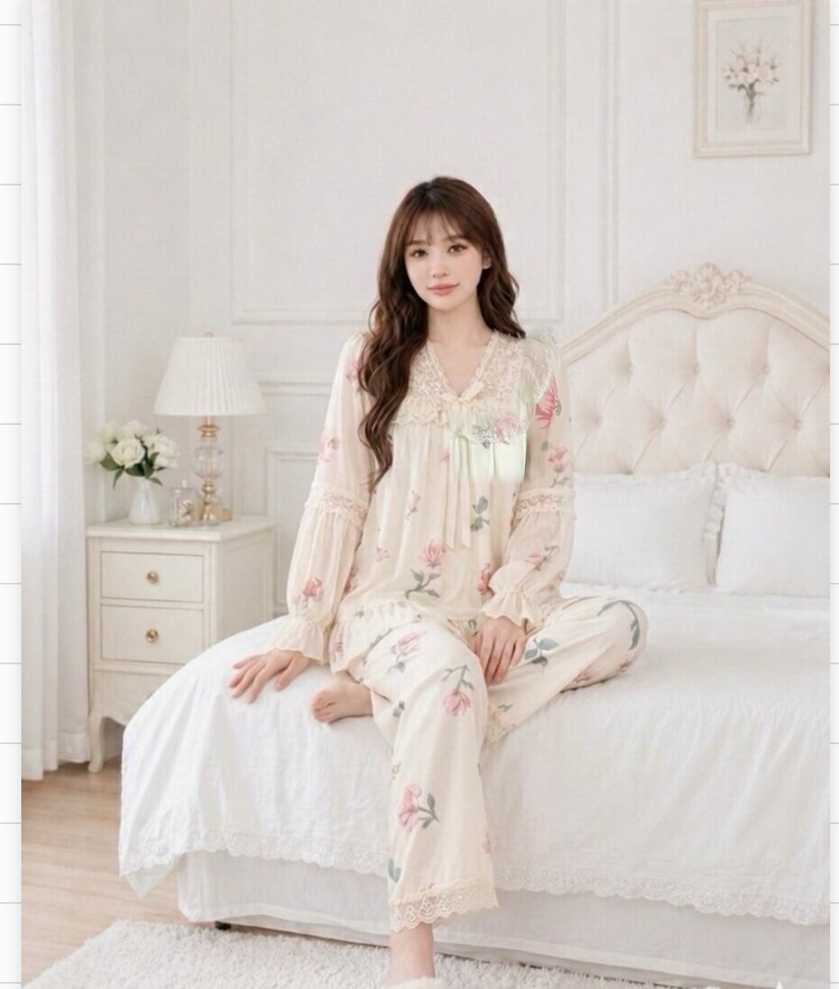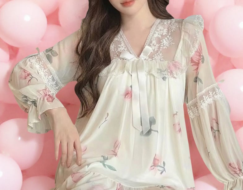 繊細なレース使いとパフスリーブが彩る、贅沢なリラックスタイム〜